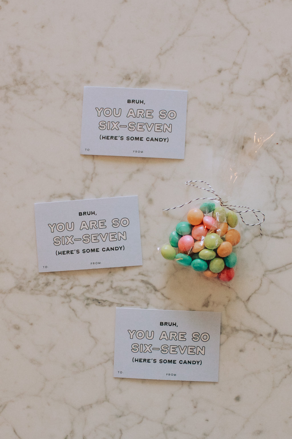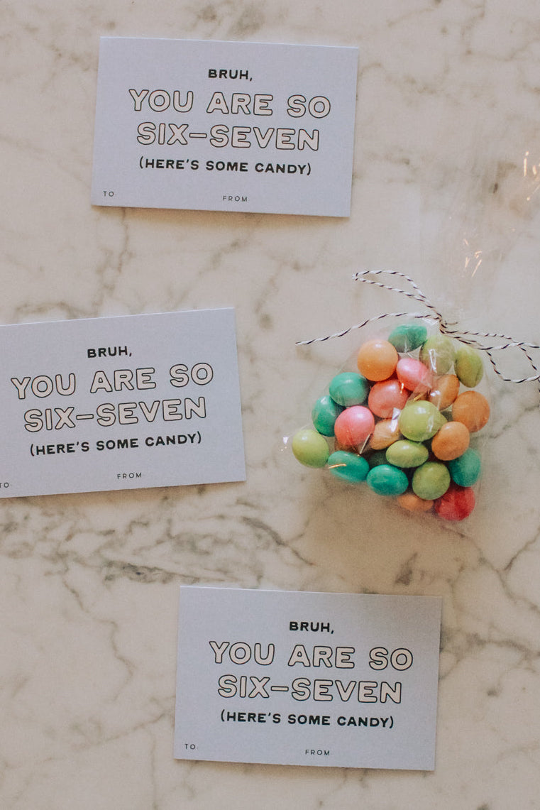 - “BRUH, YOU ARE SO SIX-SEVEN (HERE'S SOME CANDY)” design